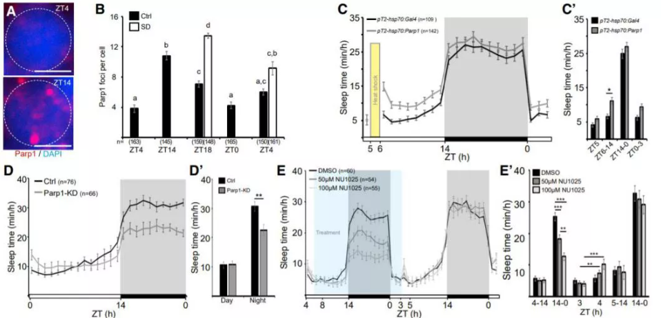 随后,研究人员进一步探究了DNA损伤修复过程中存在重要意义的PARP1蛋白的潜在作用模式。PARP1 标记细胞中的 DNA 损伤位点,并招募所有相关系统清除 DNA 损伤。根据 DNA 损伤,清醒时 PARP1 在 DNA 断裂位点的聚集增加,在睡眠时减少。通过遗传和药理学操作,PARP1 的过表达和敲低表明,增加 PARP1 不仅可以促进睡眠,还可以增加睡眠依赖性修复。相反,PARP1 的抑制阻断了 DNA 损伤修复的信号。有趣的是,鱼没有完全意识到自己累了,并没有睡觉,也没有进行 DNA 损伤修复。