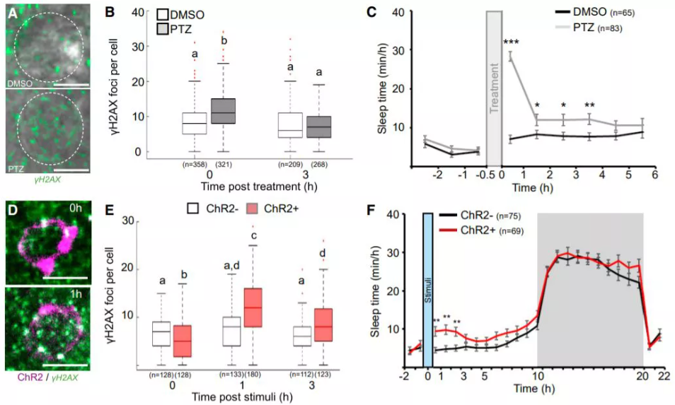 在一系列实验中,研究者试图确定 DNA 损伤的累积是否可能是触发睡眠状态的驱动因素。使用辐射、药理学和光遗传学多种实验方法,在斑马鱼上诱导 DNA 损伤,以评估其如何影响斑马鱼的睡眠。