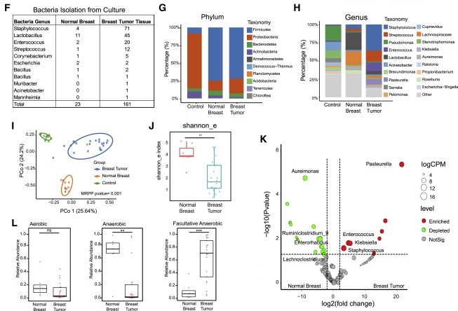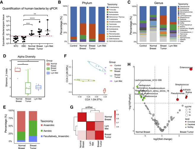 在人类乳腺癌中,原发肿瘤和转移部位之间的微生物群联系尚不清楚。通过采集伴有配对肿瘤相邻正常乳腺组织和淋巴结转移的人BT组织,通过16S测序分析其微生物菌群组成。这些数据表明,小鼠BT和人类BT具有相似的微生物群落结构和动态,表明人类BT的微生物群可能在人类癌症的发病和发展中发挥保守的作用。